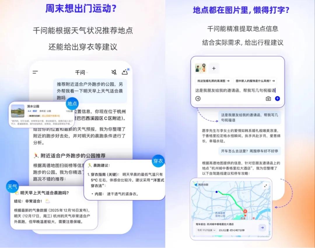 千问视觉理解能力延伸至地理场景,上传婚礼请柬截图即可提取地址推荐周边酒店,还能结合天气提供地点与穿衣建议;针对复合任务可实现 “顺路规划”,如灵隐寺行程规划同步推荐顺路咖啡店,实现导航与生活服务无缝衔接。