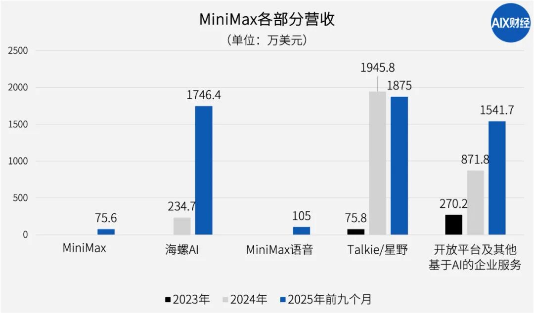回到具体产品层面,Talkie/星野依然是收入规模最大的应用,但海螺AI的增长十分迅速,2025年前九个月收入1746.4万美元,营收占比达到32.6%。