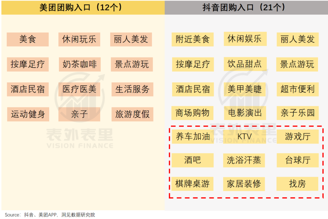 而这样爆发式增长的品类,在抖音至少还有9种。如下图,抖音比美团多出的75%团购一级入口,几乎都是差异化品类。