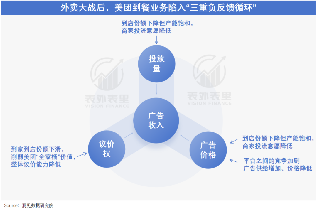 凭借差异化的策略,抖音开辟新兴市场,与美团划地而治。真正令美团阵痛的,是被迫卷入外卖大战,使其陷入了“份额丢失-广告降价-议价权降低”的“三重漩涡”。