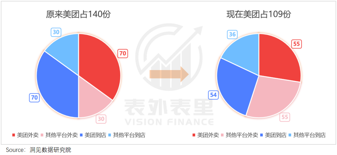 按照这个模型,抛开宏观景气,仅外卖大战,就让美团痛失大约23%的到店餐饮份额。