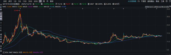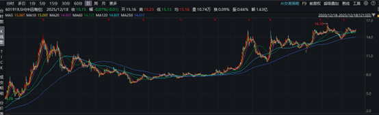 从近5年的股价走势来看,如果不考虑股息,中远海控经历了急剧拉涨,快速下跌到震荡修复的过程。高峰时股价33.4元,截至25年12月23日收盘15.4元,高点至今已下跌近55%。