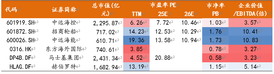 从航运业企业估值来看,马士基、东方海外国际等境外市场对航运企业给予的估值相对更低,PE仅4倍左右,市净率分别为0.58倍、0.78倍。中远海控当前PETTM及PB分别为6.26倍、1.03倍。中远海控及马士基25年预期市盈率更高,隐含盈利下滑。