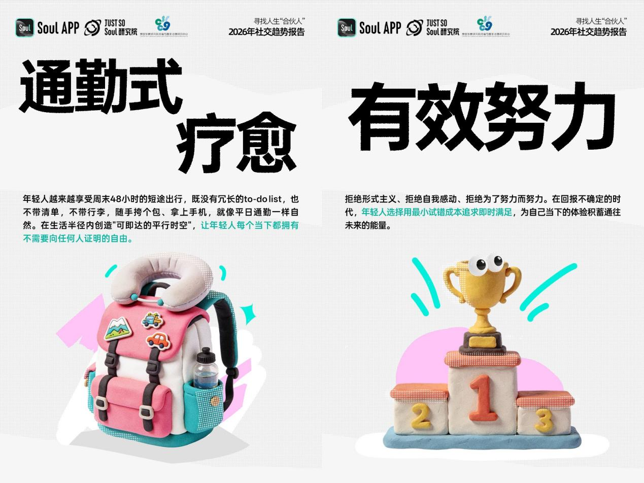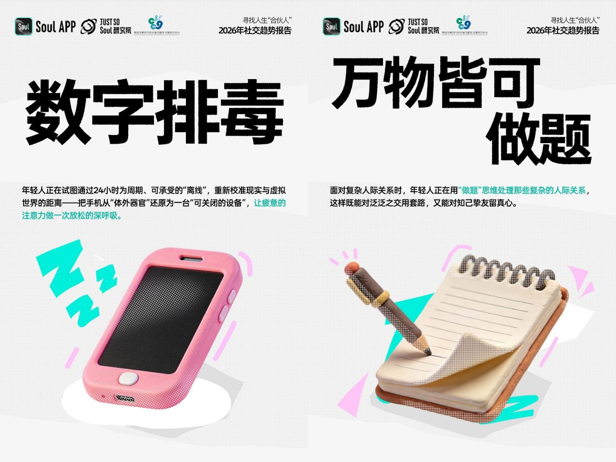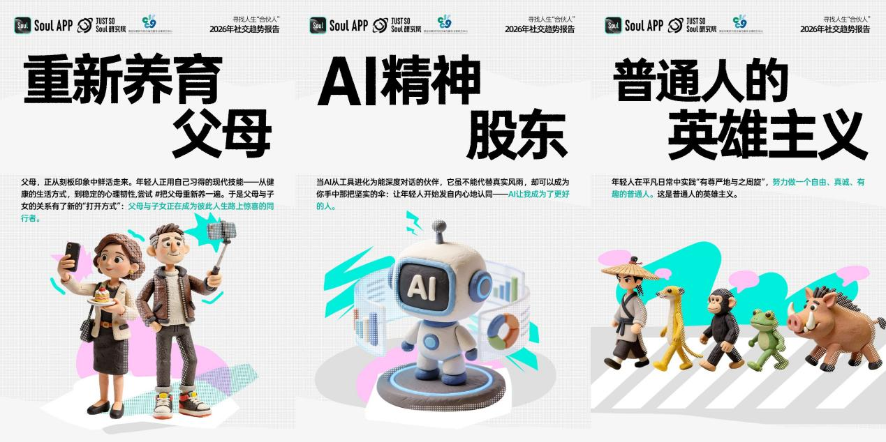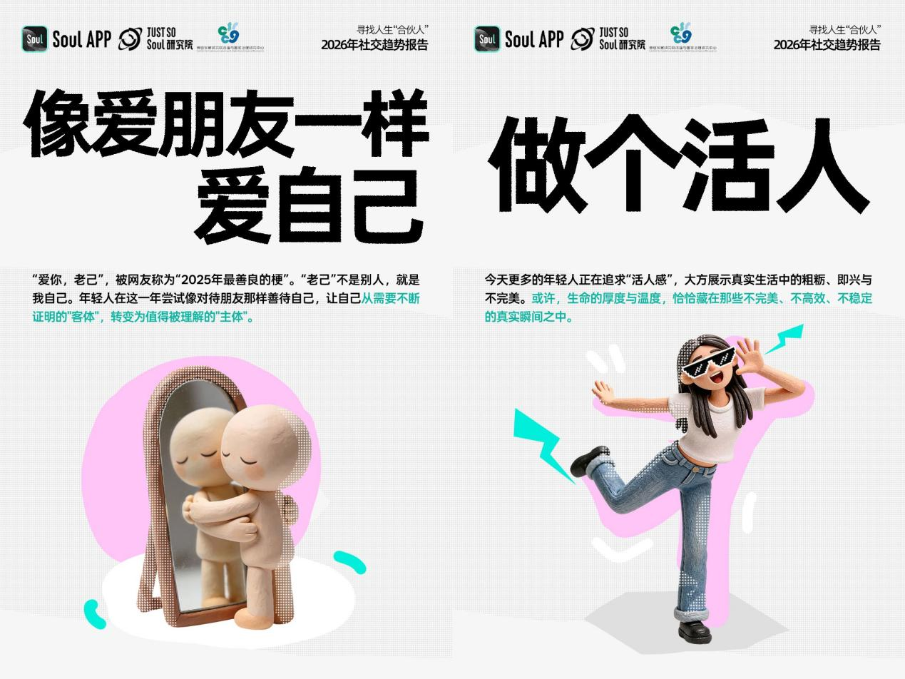 而Soul App作为年轻人喜爱的社交平台,既是记录者,也是守望者。Just So Soul连续三年的趋势洞察,让我们确信,无论世界如何变迁,人类对真实、深度且有质量连接的向往永恒不变。2026年,我们将见证更多年轻人跨越内耗的陷阱,在自己积极构建的社交图谱中,遇见志同道合的“人生合伙人”。这不仅是Soul作为社交平台的价值所在,更是记录下这个时代最动人的注脚:每一个认真生活的普通人,都是自己生命叙事里的英雄。