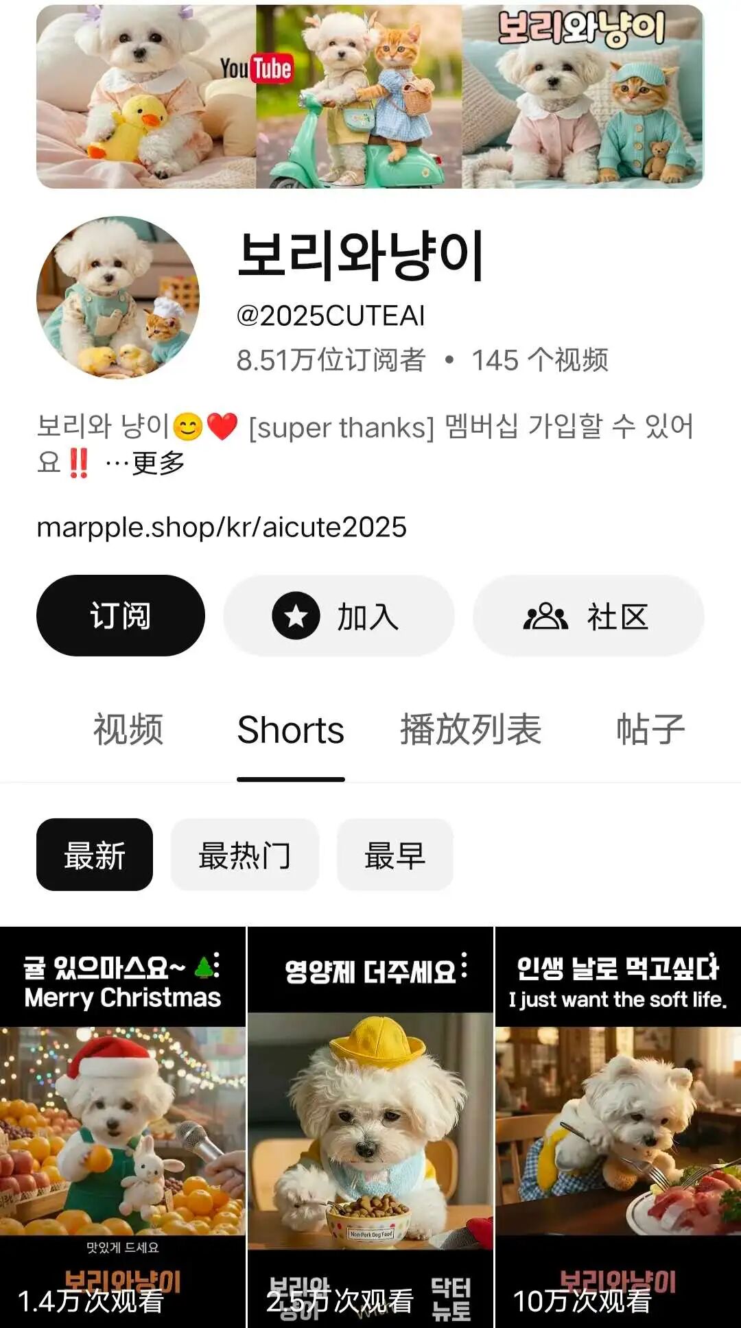 在看到“大麦”和“云朵”们的内容后,一位小红书博主也做起了AI小狗的视频。虽然将设定更换为博美犬并更新在小红书,这只小狗却说着一口韩语,模仿之意明显。事实上,YouTube、Instagram、抖音和小红书等平台挤满了类似题材的内容,以至于用户能看到穿着各种衣服打工的橘猫、念叨着“捡破烂也要养妈妈”的小狗,部分视频连代表AI生成的水印都没有被抹除——Sora、豆包、千问等应有尽有。