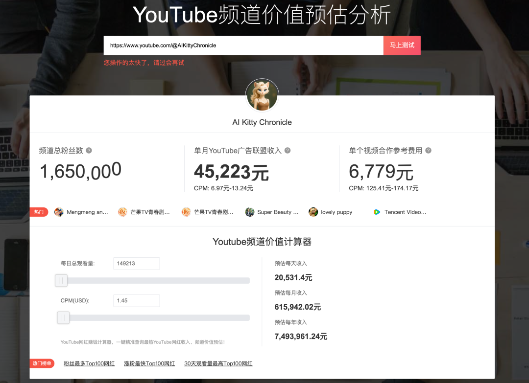 但平台广告分成依然是YouTube创作者最常见的收入来源,占比较高。用户观看的视频越多,连带观看的广告就越多,创作者的收益也就越高。一个例子是,第三方营销平台Nox Influencer发布的数据显示,订阅用户数量超过165万的YouTube频道“AI Kitty Chronicle”,其单月广告分成收入预估在45000元上下,CPM(Cost Per Mille,每千次展示费用)在6.97元至13.24元。