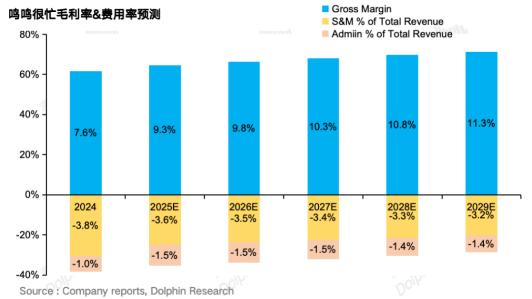费用率上,由于前期量贩零食价格战激烈,格局不稳定,因此前期很忙投入了大量门店补贴导致销售费用率居高不下,而从2025年开始很忙和万辰统一降低了补贴力度,海豚君假设在规模效应下,很忙的销售费用率从3.8%逐步下降至3.2%。