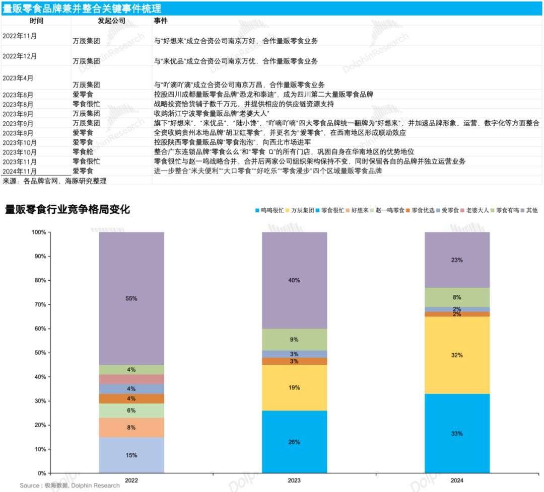 23年9月万辰集团将旗下独立运营的“陆小馋、好想来、来优品、吖滴吖滴”四大量贩零食品牌统一翻牌成“好想来”统一运营,11月行业第一的零食很忙与行业第三的赵一鸣零食战略合并为鸣鸣很忙。
