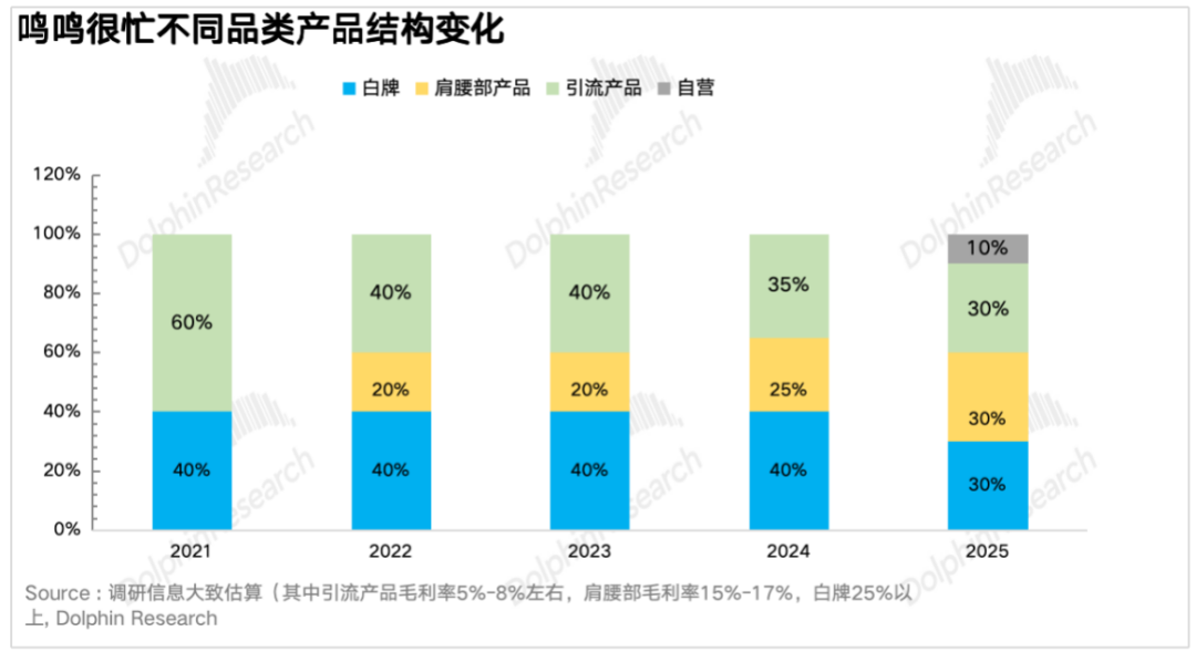 毛利率上,一方面伴随很忙开店数量的提升,采购规模增加对上游的议价能力增强,另一方面,从产品结构角度,结合调研信息,从下图可以看到盈利能力更强的肩腰部、白牌和自营产品占比也在逐步提升,因此,海豚君假设从2025年开始很忙的毛利率进入上升通道,从9.3%提升到11.3%。