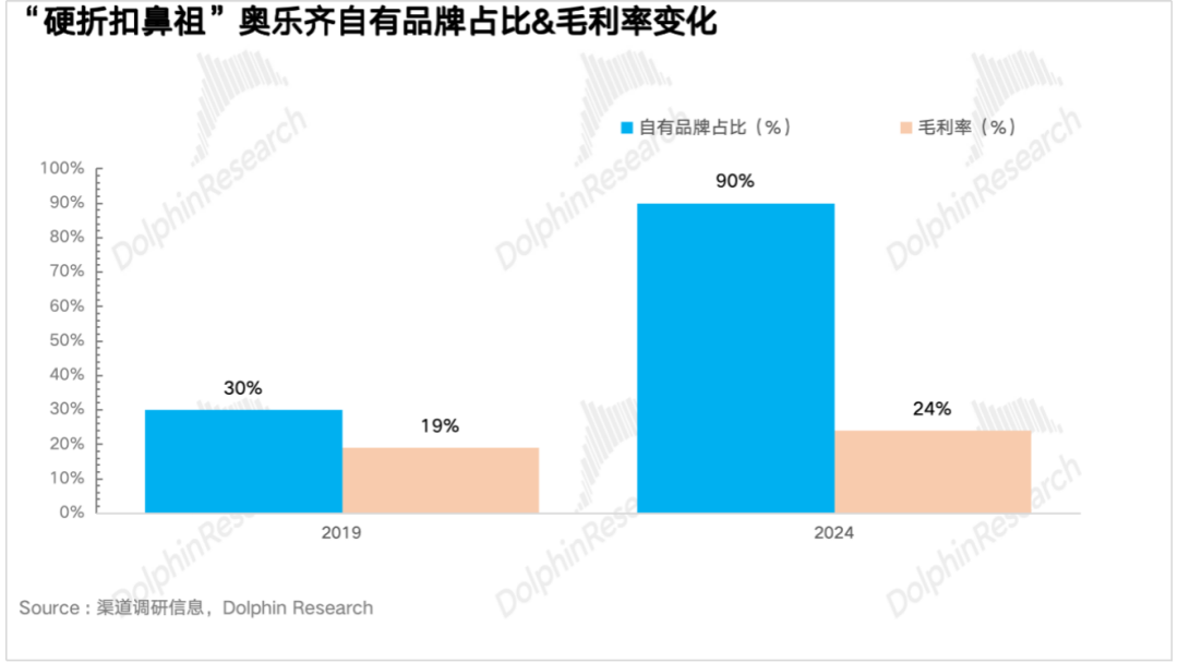 以“硬折扣鼻祖”奥乐齐为例,可以看到奥乐齐从2019年进入中国以来,伴随本土化供应链的搭建,自有品牌占比从最初30%提升到2024年接近90%,相应的毛利率从不到20%提升到24%左右。