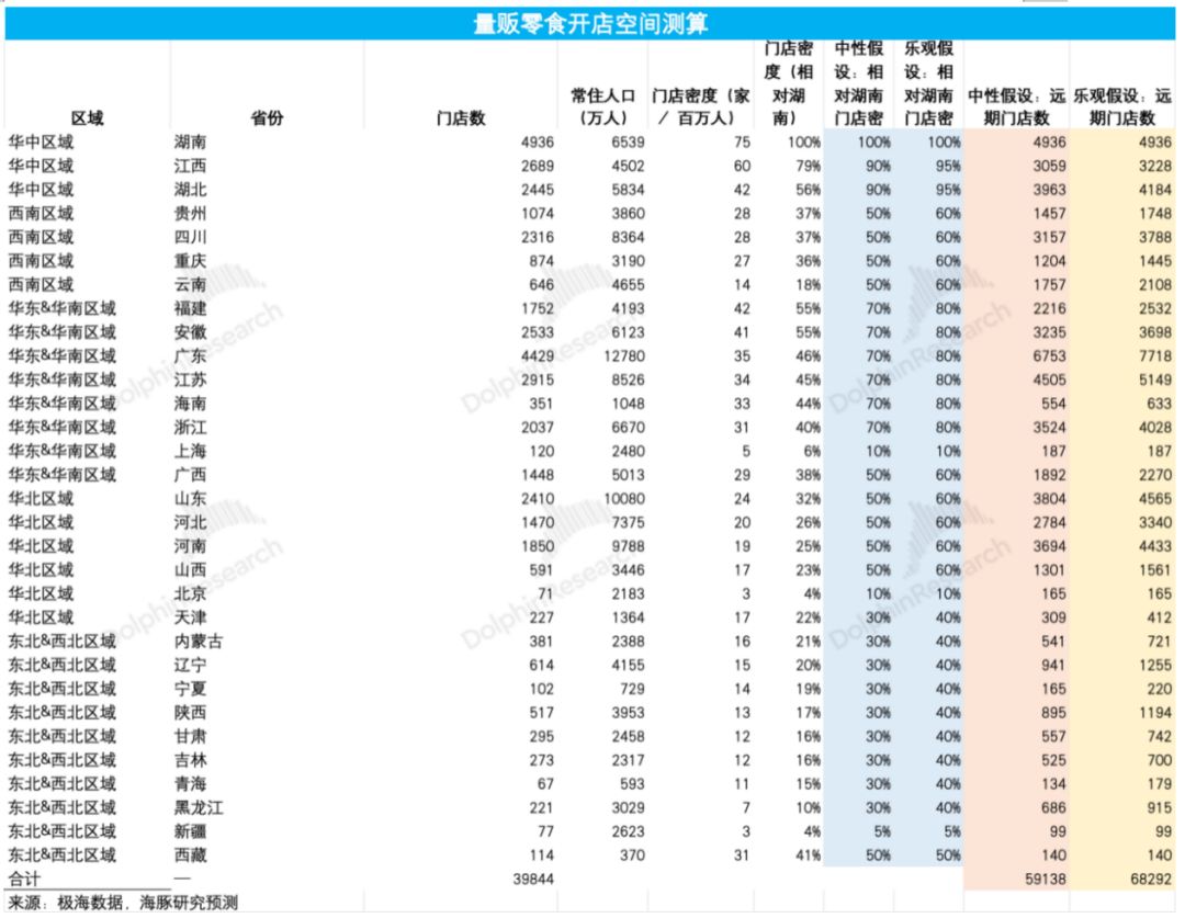 因此,我们把湖南省的门店密度作为上限,按照当前量贩零食在各区域的渗透情况,中性情况下我们假设华中地区、华东&华南、华北、东北&西北的门店密度分别达到湖南省的90%、70%、50%、30%,中期来看总体的量贩零食门店有望达到6万家;而乐观情况下,假设各地区的门店密度分别达到湖南省的95%、80%、60%、40%,总门店数量则有望接7万家。