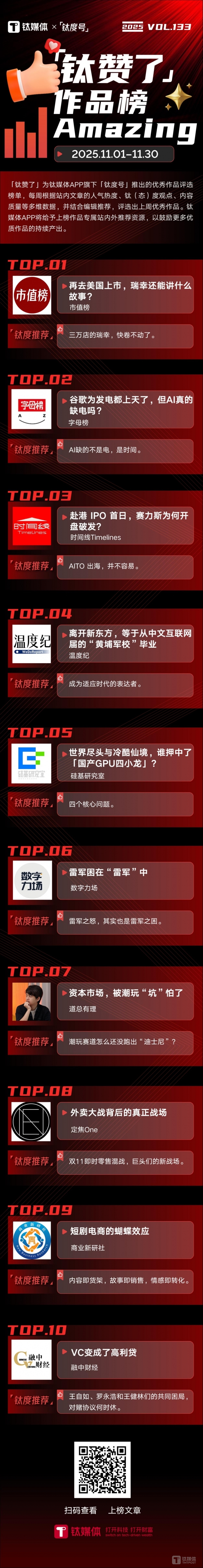 2025年11月1日—2025年11月30日,「钛赞了」榜单第133期上榜作品为: