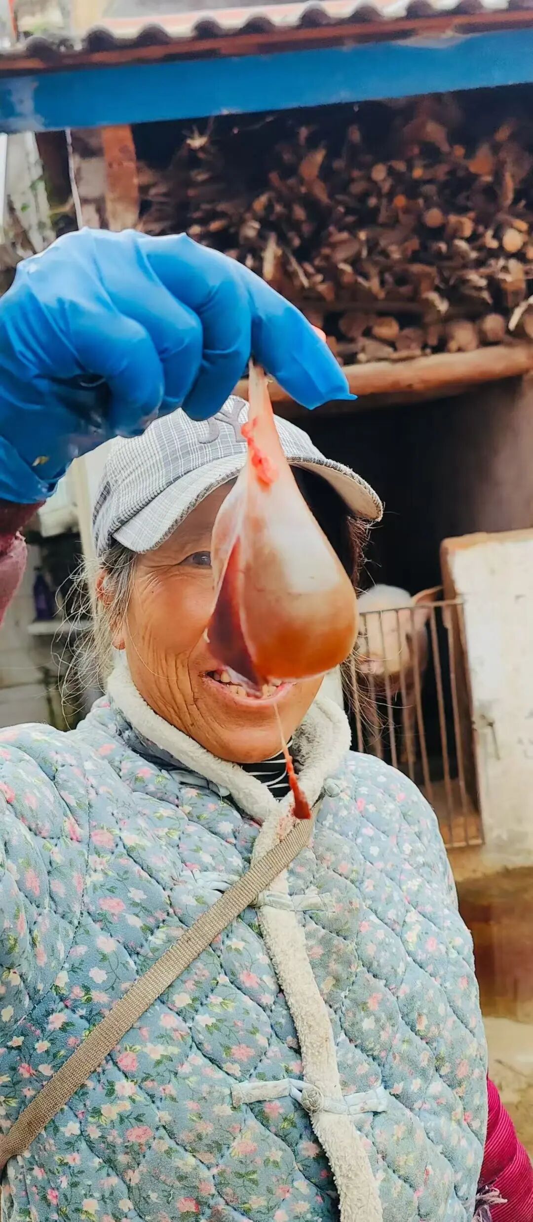 在火塘边,二万抬头望了望大姑姑家房梁上的猪胆,又翻相册看了看自家今年的猪胆。那天晚上,他发了两条朋友圈: