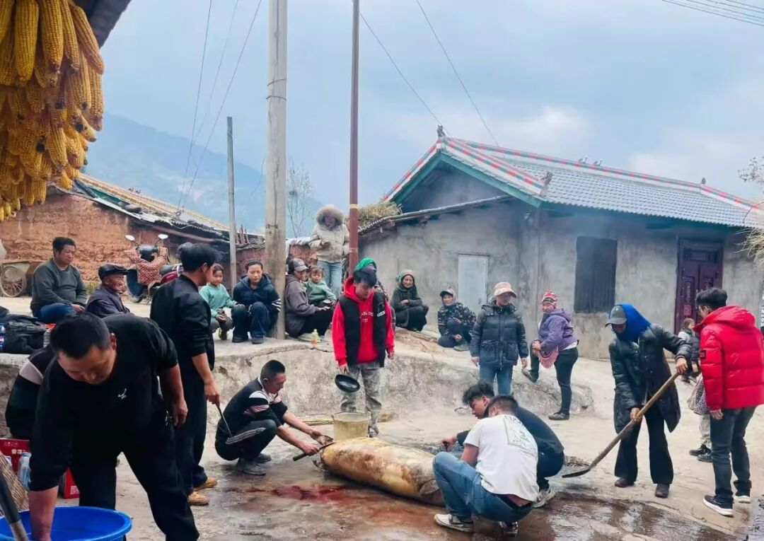 二万告诉我,大家正忙着杀年猪。这活计要靠邻里间的壮小伙结伴,挨家挨户去帮忙。毕竟年猪太重,一家人按不住。