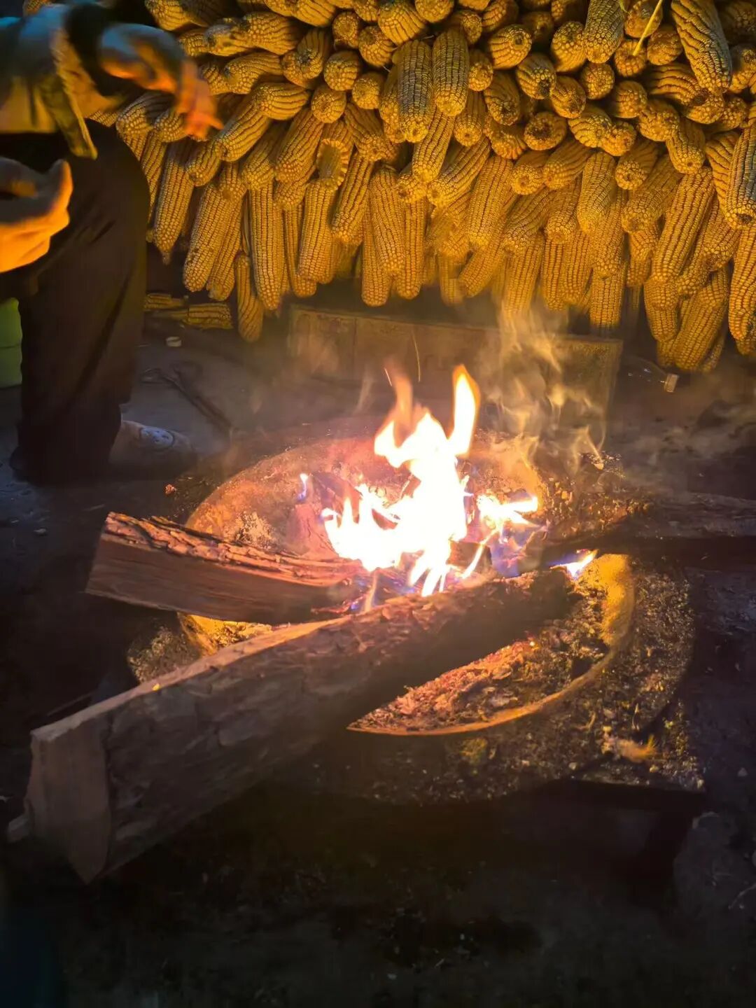 第二句,发生在过年最后一天的凌晨。按习俗该撤下献给祖灵的贡品,其中有荞麦馍馍、燕麦等,那是大凉山物资更匮乏时的食物。大家会分食一些,既是忆苦思甜,也意味着获得了祖先的庇佑。