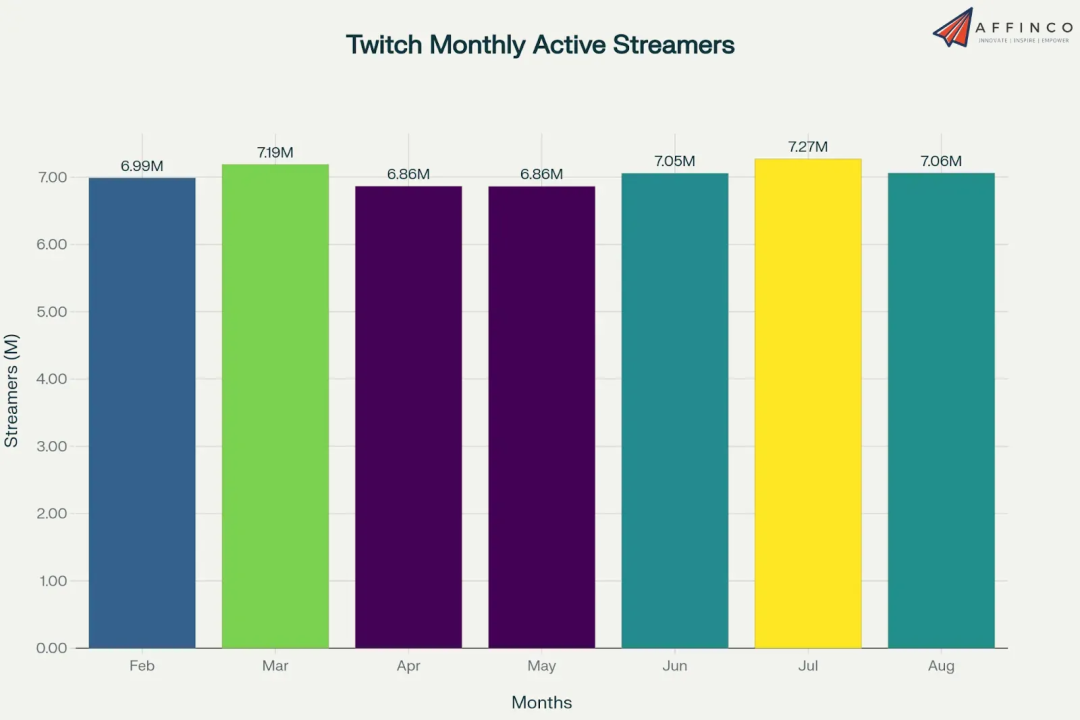 |2025 年 2 至 8 月,Twitch 每月平均的游戏直播数在 730 万左右。图源:AFFINCO