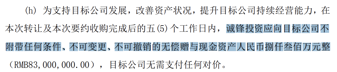 看点三,该笔交易中还出现了罕见的无偿捐赠承诺,即锋龙股份的原控股股东要在要交易完成后向上市公司无偿捐赠8300万元,用于支持公司发展、改善资产状况。