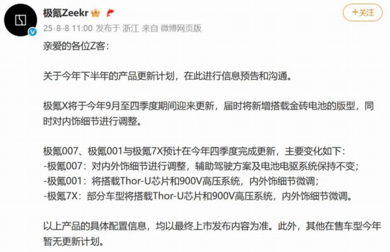 比如,早在 8 月上旬,极氪就公布了年度产品更新计划,提前向消费者做了一次透明预告,宣布了极氪 X、极氪 007、极氪 001、极氪 7X 等已发布车型的更新计划——与此同时,针对现款车型,则给予更加优惠的购车政策。