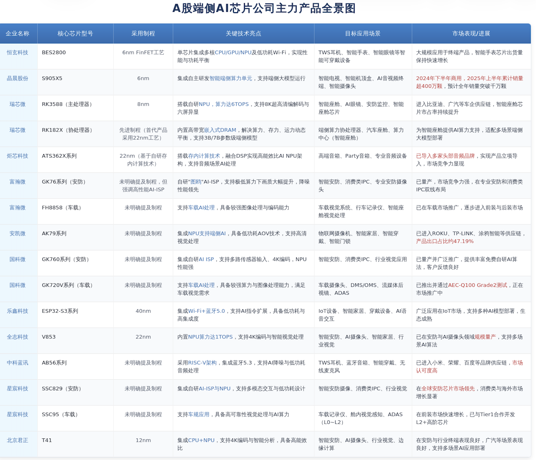 可见的仅有炬芯科技将 “端侧AI处理器芯片系列”与“智能无线音频SoC芯片”、“便携式音视频SoC芯片”并列为三大核心产品线,2025年上半年其端侧AI处理器芯片系列营收占比为18.80%。