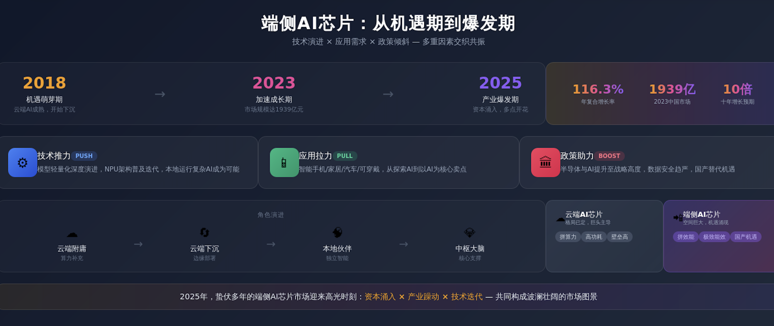 2018年,端侧AI芯片是一个充满机遇的新兴领域,2025年,已演变为热浪滚滚的产业大爆发。过程背后并非单一因素驱动的线性发展,而是一个由技术演进、应用需求爆发、宏观政策倾斜等多重因素交织共振的复杂过程。