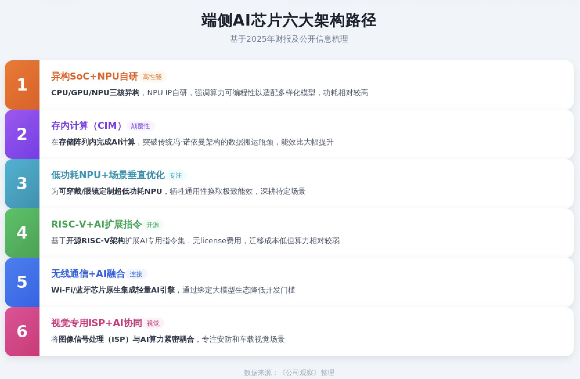 基于2025年财报及公开信息梳理,《公司观察》发现当前主要存在六大架构路径。这六大路线各有代表性玩家,目前均有生存空间,不过,据估计5年内也将从格局分化逐渐过渡到收敛整合。这个过程中,昔日“当红”的一些传统安防芯片龙头厂商在端侧AI赛道上渐显落寞。