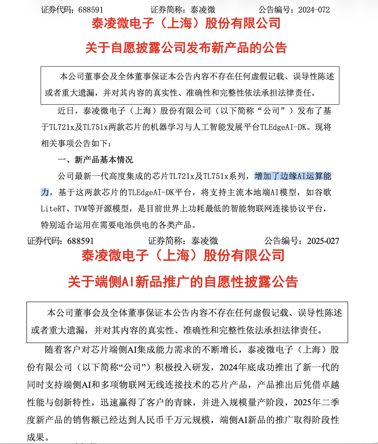 2024岁末,传统叙事突然发生转折。12月18日,泰凌微发布一份带有明显“市场教育”和“预期管理”特征的《自愿披露新产品公告》,称其新一代芯片产品“增加了边缘AI运算能力”,“是目前世界上功耗最低的智能物联网连接协议平台,特别适合运用在需要电池供电的各类产品。”