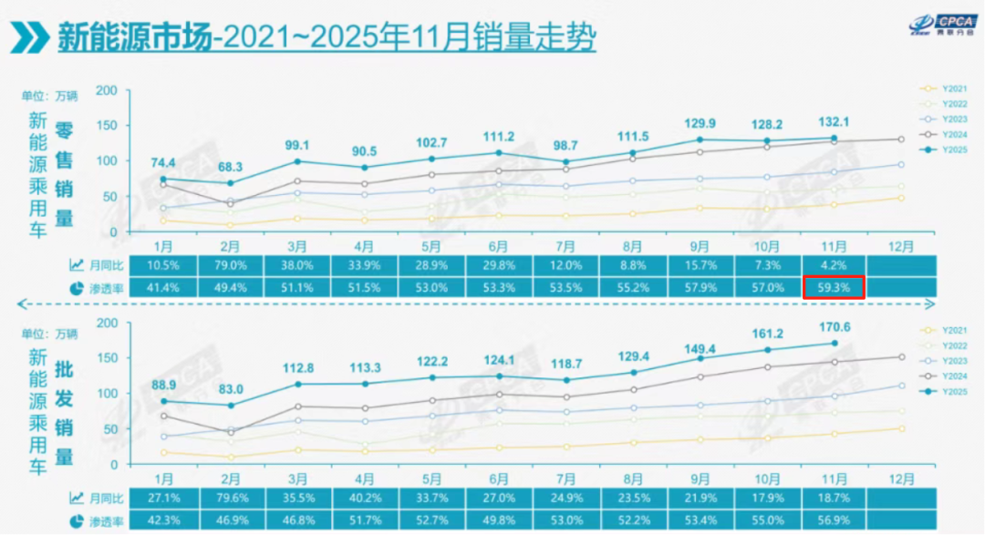 不止是充电站附近电车扎堆,丁骁勇明显感受到了近两年路上跑的电车是一辆接着一辆。事实确实如此,2025年11月,我国新能源汽车零售渗透率历史性地接近60%大关。这意味着每卖出10辆车,就有6辆是绿牌车。