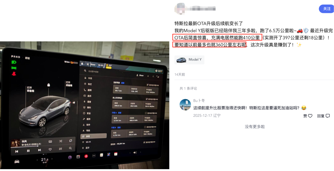 图/某特斯拉车主分享OTA升级后续航增加 来源/互联网 新能源观截图