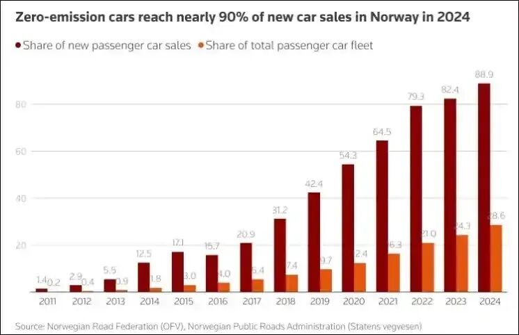 图/零排放汽车占挪威新车销量比例 来源/互联网 新能源观截图