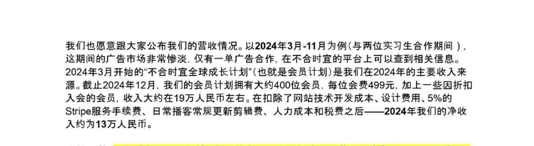 此前,播客节目《不合时宜》的创作者曾披露过节目一年的收入,该节目在小宇宙上拥有50多万粉丝,而其在2024年3月至11月期间,只拿到一单广告合作,会员收入大约为19万元,到手净利润约为13万元。