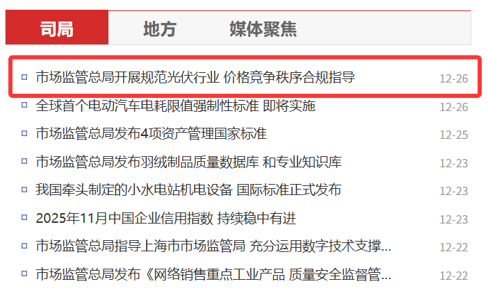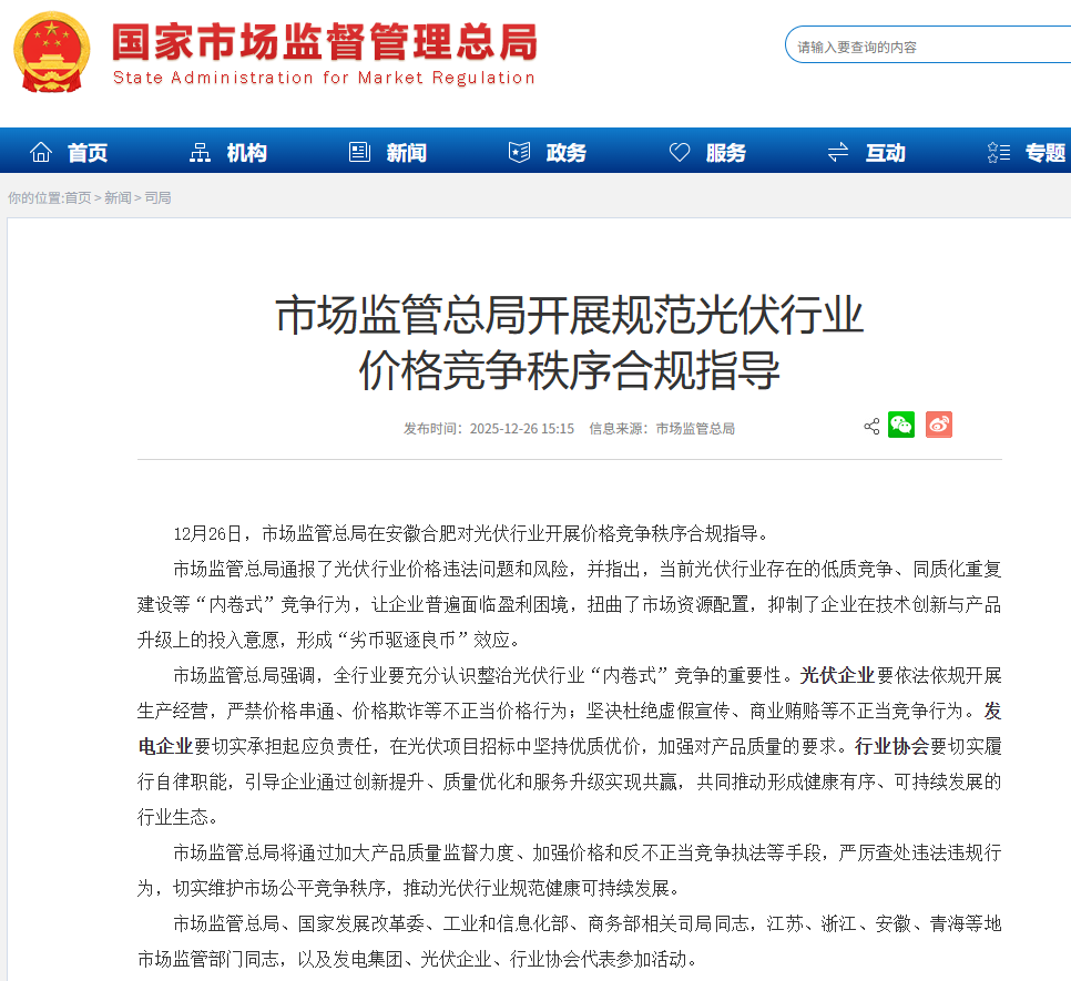 12月26日,权威媒体新华社、人民日报等均报道了光伏行业的一则重磅新闻,标题为《市场监管总局开展规范光伏行业价格竞争秩序合规指导》。正文如下: