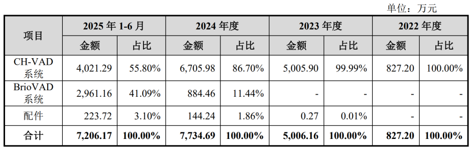 2021年11月,CH-VAD获国家药品监督管理局批准上市,截至招股说明书签署之日,该产品已在全国80多家医院完成了670余例临床植入。自2022年至2024年,CH-VAD销售收入由827.20万元增长至6,705.98万元。