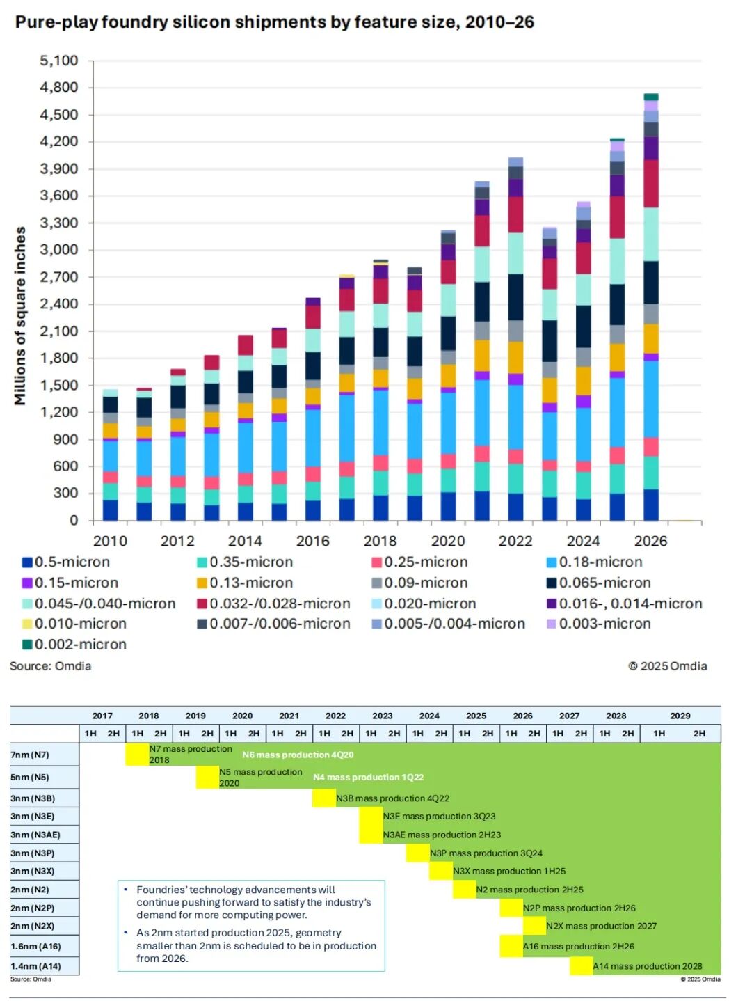 从代工来看,高性能计算(HPC)将在2026年主导芯片代工、技术进步及营收增长。Omdia数据,2026年,7nm到2nm硅预计将占总收入的59%,但只占纯代工厂行业硅总出货量的10%