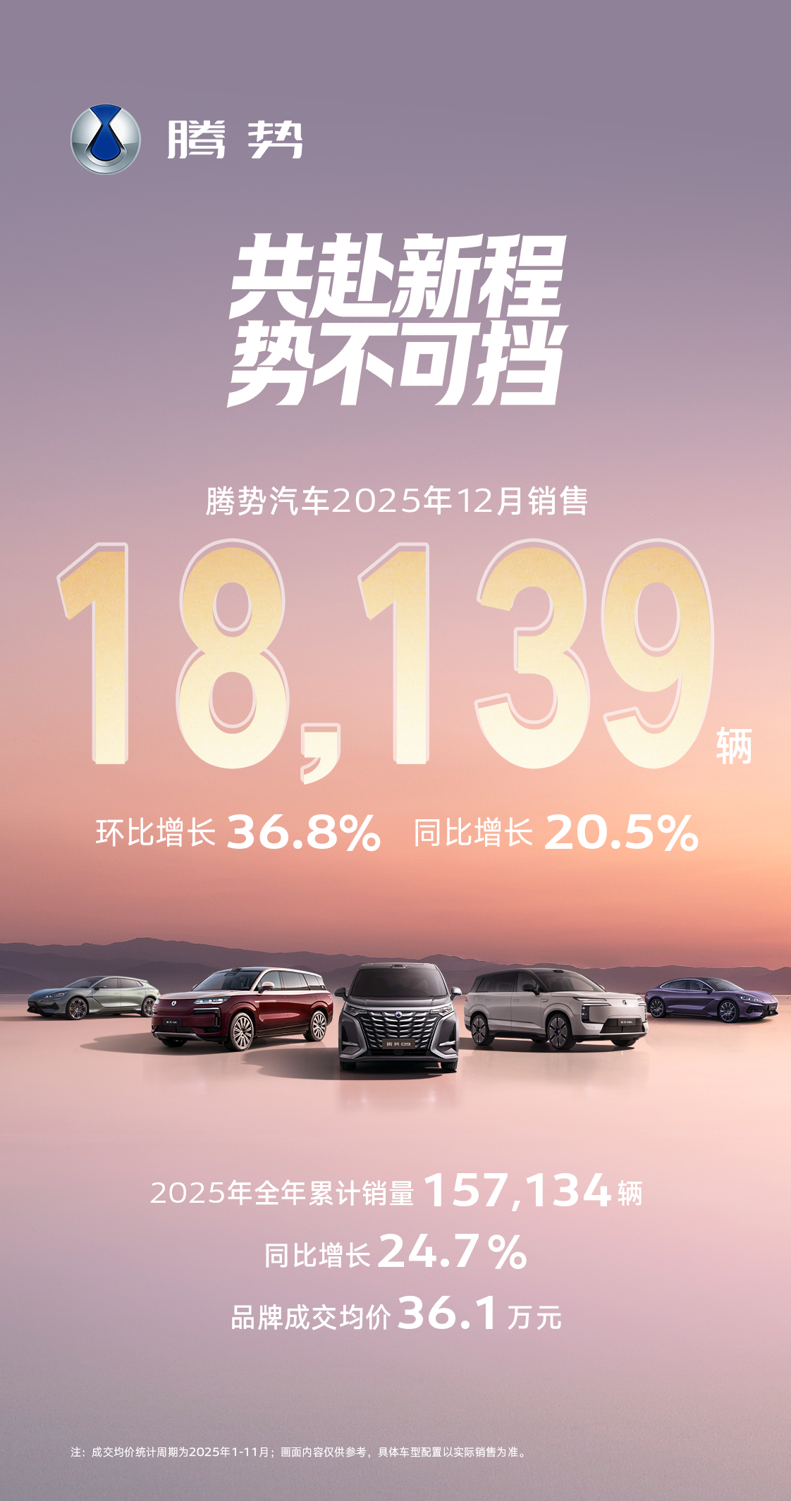 2025年12月,腾势单月销量18139辆,环比增长36.8%,同比增长20.5%;全年累计销量157134辆,同比增长24.7%;更值得注意的是,品牌全年成交均价维持在36.1万元的高位区间。