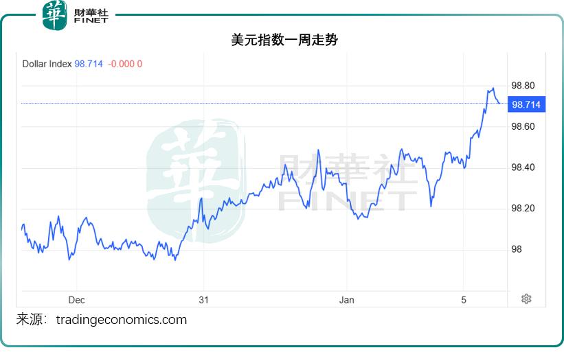 委内瑞拉事件后,美元指数一度上扬,见下图,美元指数曾升至贴近98.80水平,但现在回落至98.7左右。