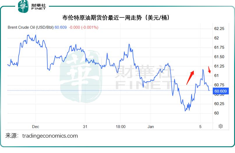 如前文所述,委内瑞拉尽管拥有全球最大的石油储量,但由于近年原油产量不高——占全球产量不到1%,暂时停产对全球原油供应的影响应不大。潜在影响或在于美国对其他产油国的压力,包括伊朗,加上OPEC+八国暂停增产,市场或担心会令原油供应收紧,布伦特原油期货价格一度冲上每桶61美元以上水平,但随后回落,现报每桶60.61美元,见下图,短期波动幅度较大。