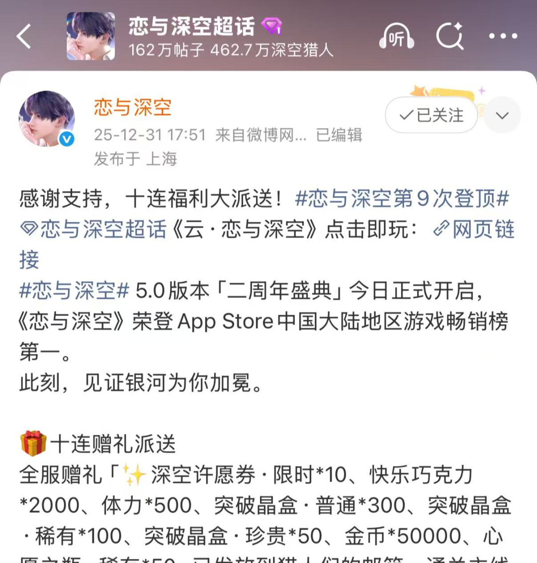 时间线拉回2025年12月下旬,《恋与深空》官方放出5.0版本预告,主打“家园共建”概念,还特意强调“以你为主体”,从不动产权证书到男主登门拜访,再到自由规划花园家具,字里行间都在暗示“专属二人世界”。玩家们一下子就拉满了期待,毕竟谁不想和自己的虚拟男友拥有一个温馨小窝?蹲更新的日子里,超话里全是晒设计草图、脑补同居日常的帖子,甚至有人提前氪好了装修基金。