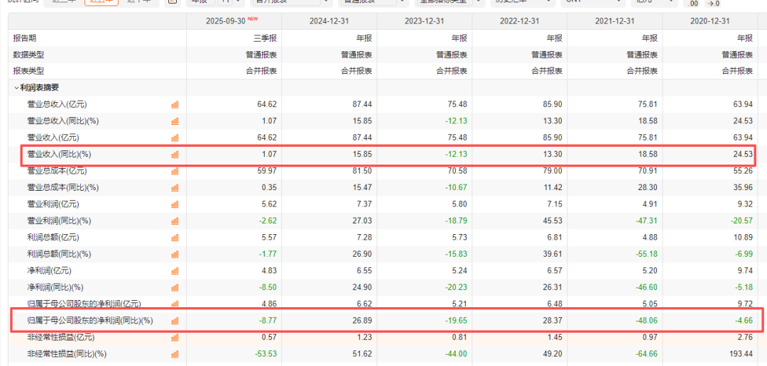 到了2025年,情况依然没有扭转,前三季度,营收增速仅剩1.07%,几乎原地踏步,归母净利润同比还倒退了8.77%。