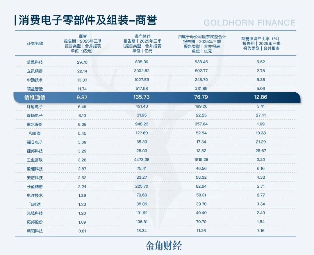 反观信维通信,总资产只有135.73亿元,净资产为76.79亿元——在这种体量下扛着近10亿元商誉,意味着它不仅在绝对值上“靠前”,在相对资产规模上的负担也相当沉重。