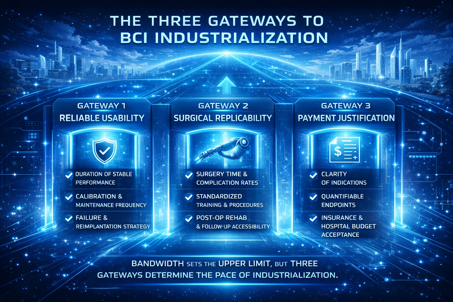 将脑机接口产业化,从来不仅仅是提升带宽或通道数。我们更需要看三道门是否能够同时打开。这三道门分别是:长期可靠使用、手术可复制性和支付可解释性。