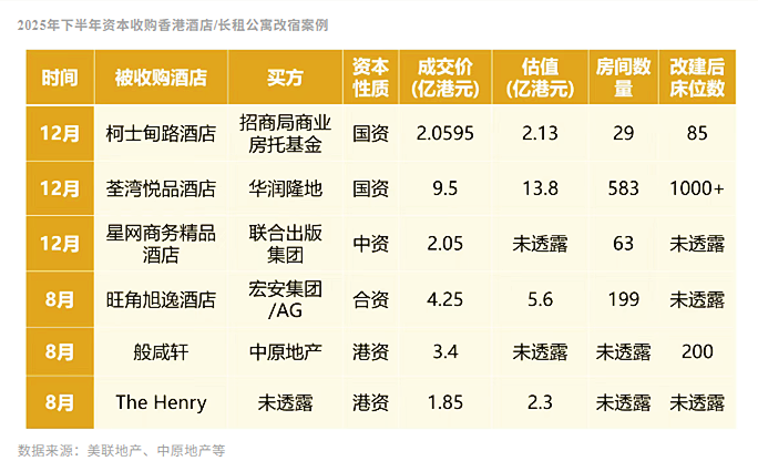 以上并非2025年内国资“进场”的个案。继2025年4月荃湾悦品酒店宣布招标放售后,12月,有消息称该物业已被华润隆地斥资约9.5亿港元买入,目前正在进行尽职审查,日后将用作学生公寓。
