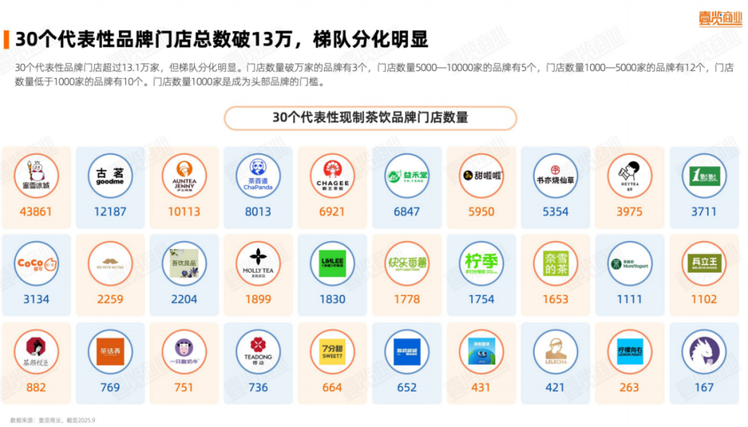 截至2025年,全国(不含港澳台)现制茶饮门店总量已突破41.5万家,全国30个代表性现制茶饮品牌门店总量已突破13.1万家。头部品牌“巨无霸”效应显著,蜜雪冰城以4.38万家门店稳居首位,古茗1.2万家位列第二,霸王茶姬以1.01万家屈居第三。