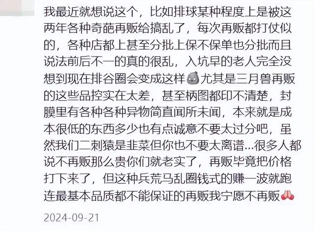 社媒上不少声音认为“排咒锁”等大热IP的加速崩盘与大代理商的运作不当相关。价格“跳水”的恐慌情绪很容易进一步传导蔓延,感到自己亏了的粉丝急于脱手寻找下家,目睹行情下行的中小代理趋向保守,头部代理商为了缓和仓储压力进一步降价——二手市场追涨杀跌的趋势和股市同理,下行一旦开始就很难停止。