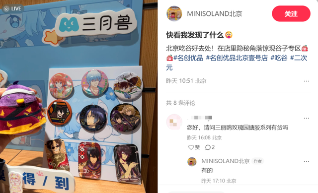 目前,名创优品已经与三月兽达成合作,在多地的MINISO LAND壹号店设置了谷子专区。
