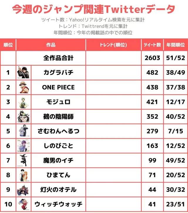 以日本业界巨头《少年周刊JUMP》为例,代表性作品断档的问题已经持续多年。一度被视为新生代台柱的《咒术回战》和《我推的孩子》也都已经在24年以欠佳的风评完结。在12月22日的JUMP相关推特趋势榜单中,除了不定期休刊的《海贼王》,几乎没有能在引进内地后还具有一定热度的作品。