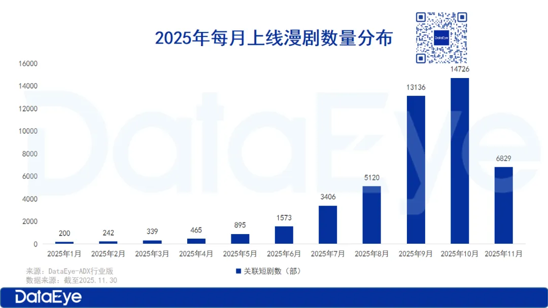 从月度数据看,9月上线了13136部,10月进一步攀升至14726部,9月和10月的漫剧上线量占全年在播漫剧总数的59.37%,创下年度峰值;但11月上线量大幅回落至6829部,较10月环比下降53.6%,出现显著的“上新腰斩”现象。