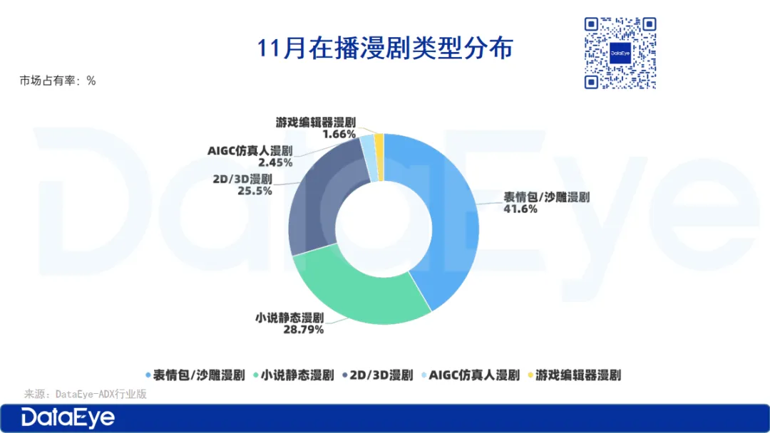 从漫剧类型来看,当前漫剧市场上热播的漫剧类型以表情包沙雕漫占据主流,占比达41.6%,凭借制作成本低、更新周期短的优势,成为中小剧场号的核心选择。