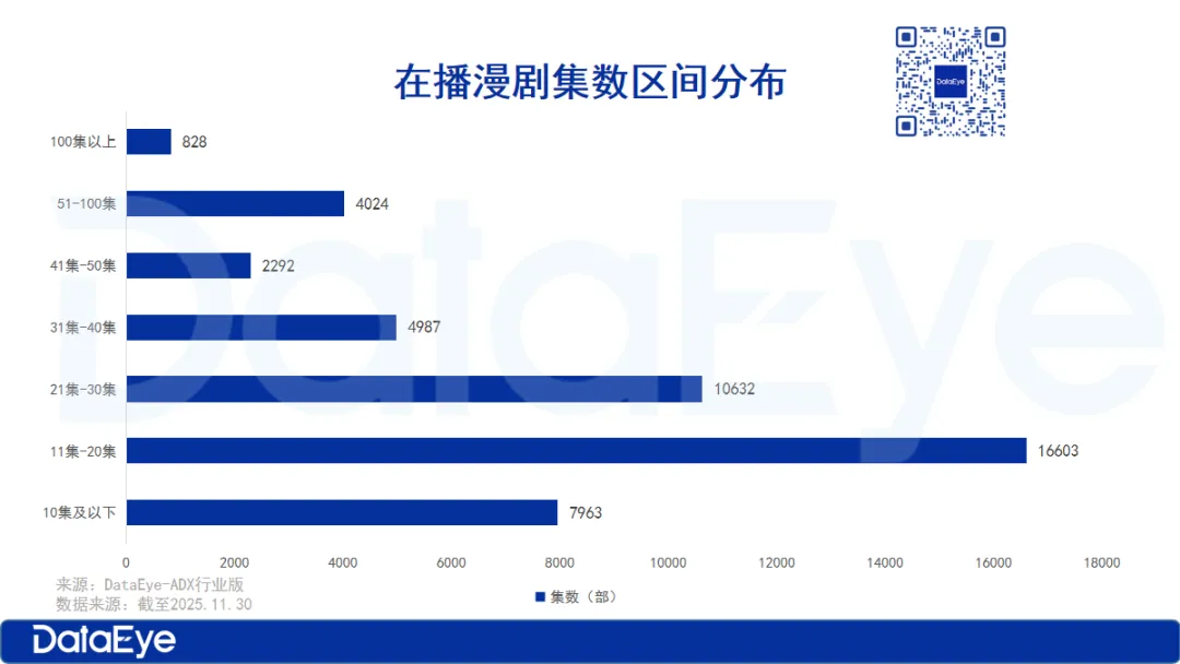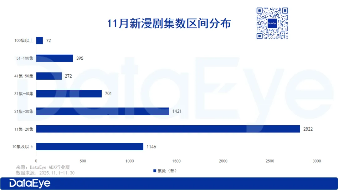 但单从11月新上线的漫剧来看,也是以20-40集的漫剧数量居多,共4944部,占比超70%。因此,DataEye短剧观察建议,漫剧厂商在制作漫剧时,可以考虑增加单剧时长,缩短单剧的更新周期来提高用户留存,也可以参考短剧的更新模式,一次全集上线,将单剧切分为3-5min的短剧集。