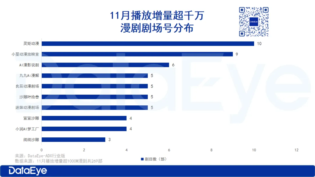 但从市场反响来看,在播漫剧中,11月播放增量超1000W的漫剧共269部,其中“灵矩动漫”剧场号占10部,其中1部为新剧;其次是“小星动漫放映室”剧场号占9部,其中7部为新剧;第三是“AI漫影说剧”剧场号占6部,6部均为新剧。热播漫剧中,播放量最高的为《边关不用我守》,11月播放增量达1.62亿。