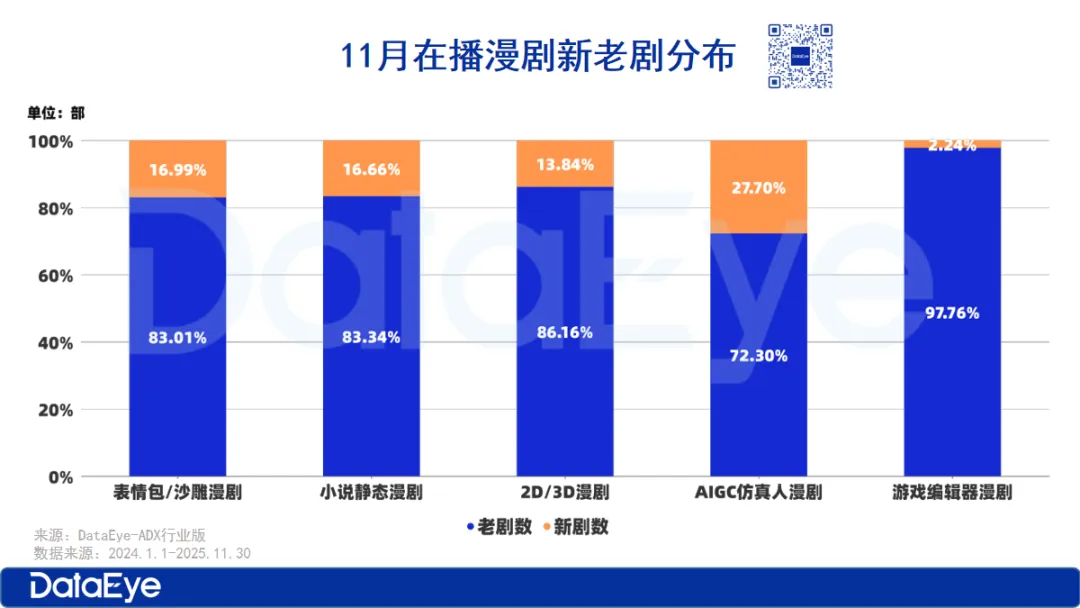 根据DataEye-ADX行业版数据显示,2025年11月依旧在播的漫剧总数达47329部(含2024年上线并持续在播剧目),市场供给充足。11月总体的播放增量达154.19亿,其中新上线剧的播放增量达56.82亿,占11月总体播放增量的36.85%。